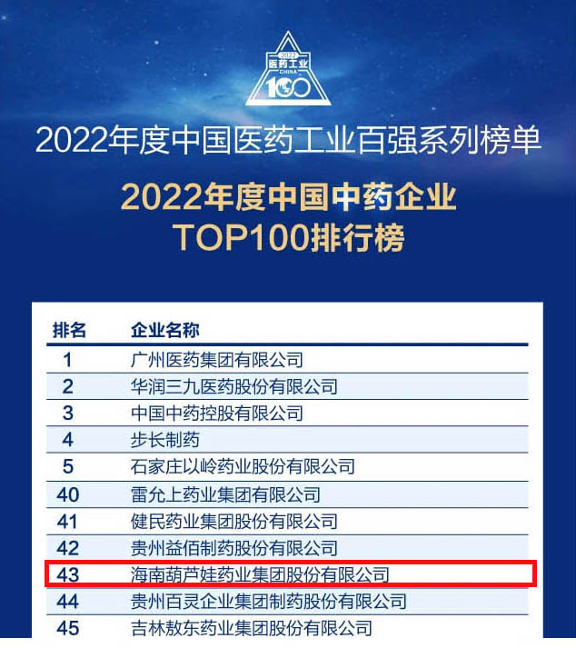 会议期间,一年一度的中国医药工业百强系列榜单隆重揭晓,尊龙官方网站药业集团凭借领先的研发优势和扎实的生产实力以及稳健的市场推广能力,连续第四年成功入选“2022年度中国中药企业TOP100排行榜” ,排名稳步上升至第43位。